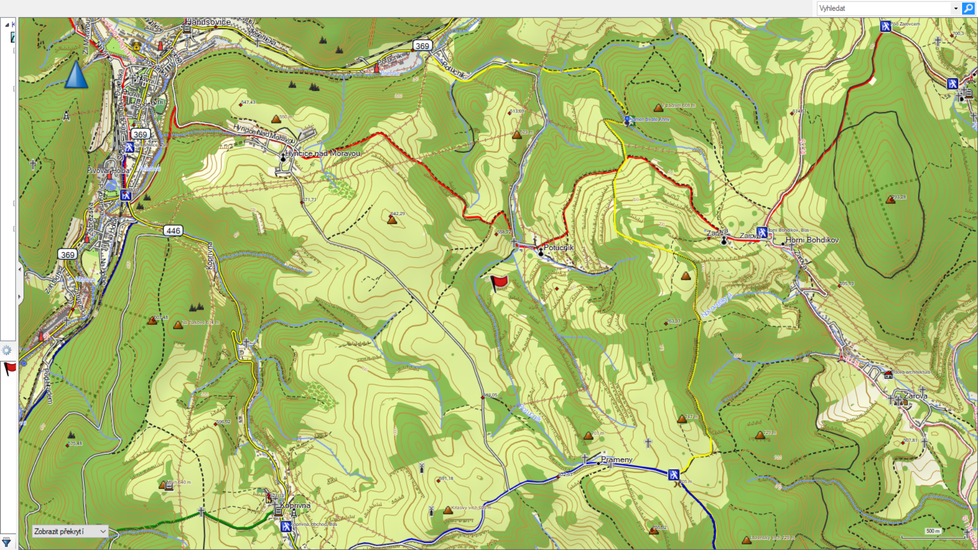 - vrstevnice včetně výškových dat (funguje výpočet výškového profilu trasy)
